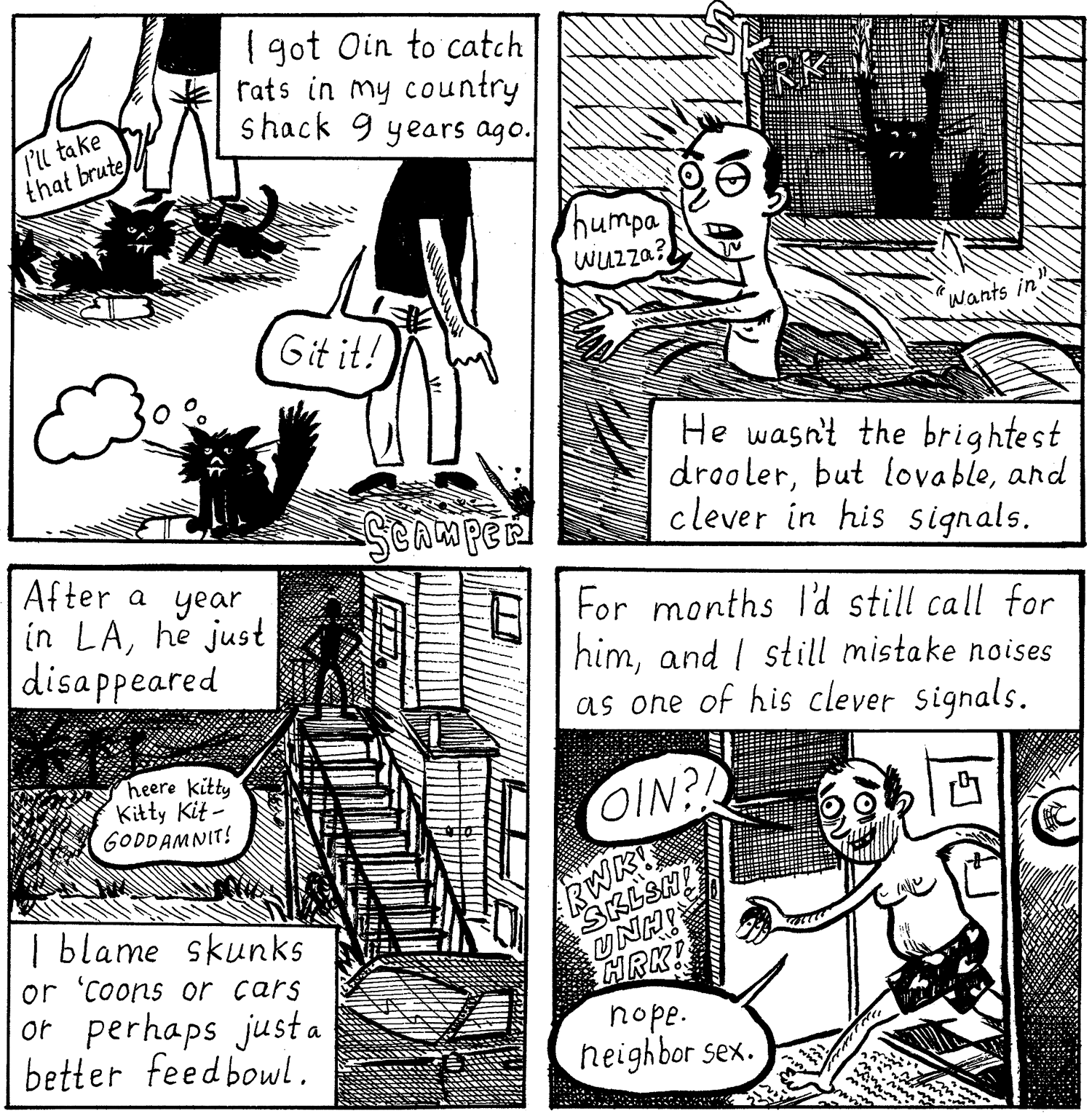 Oin had always been an outdoor cat. I strongly disagree with people keeping cats from going outside (though I keep my yap shut nowadays, as with most things). I can easily hear some friends arguing that he’d be here if I’d just kept him inside. But I’d also have a house that smelled like lingering catshit, and he’d have a completely different, likely hostile, temperament. I just don’t get why people have predators as pets and don’t let them be what they are, as God Intended Them To Be (ha), holding them back from going outside and nearly killing birds and rats and voles and mice, then playing with their half-dead bodies for 30 minutes before dragging them to the kitchen floor and howling with joy.