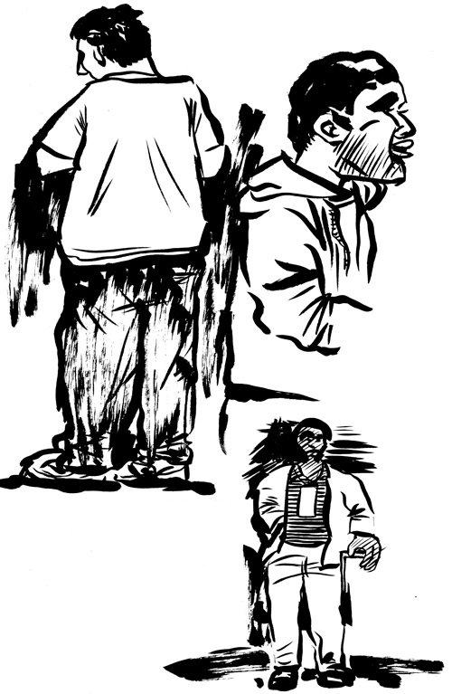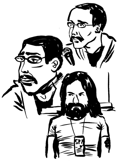 I also thoroughly flickr photo-documented my recent SPX attendance, the Bethesda, Maryland comic convention. I don’t have too much more to add except some sketches from the weekend, mostly from “The New Action” panel, with Shawn Cheng (the one person I couldn’t manage to draw, wtf?), Benjamin Marra (super easy to draw), Frank Santoro (who I made look like V) and Kazimir Strzepek (also kind of difficult to draw).